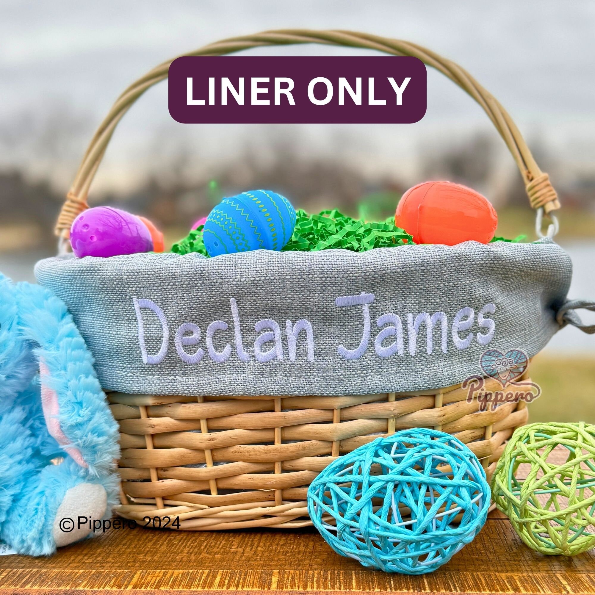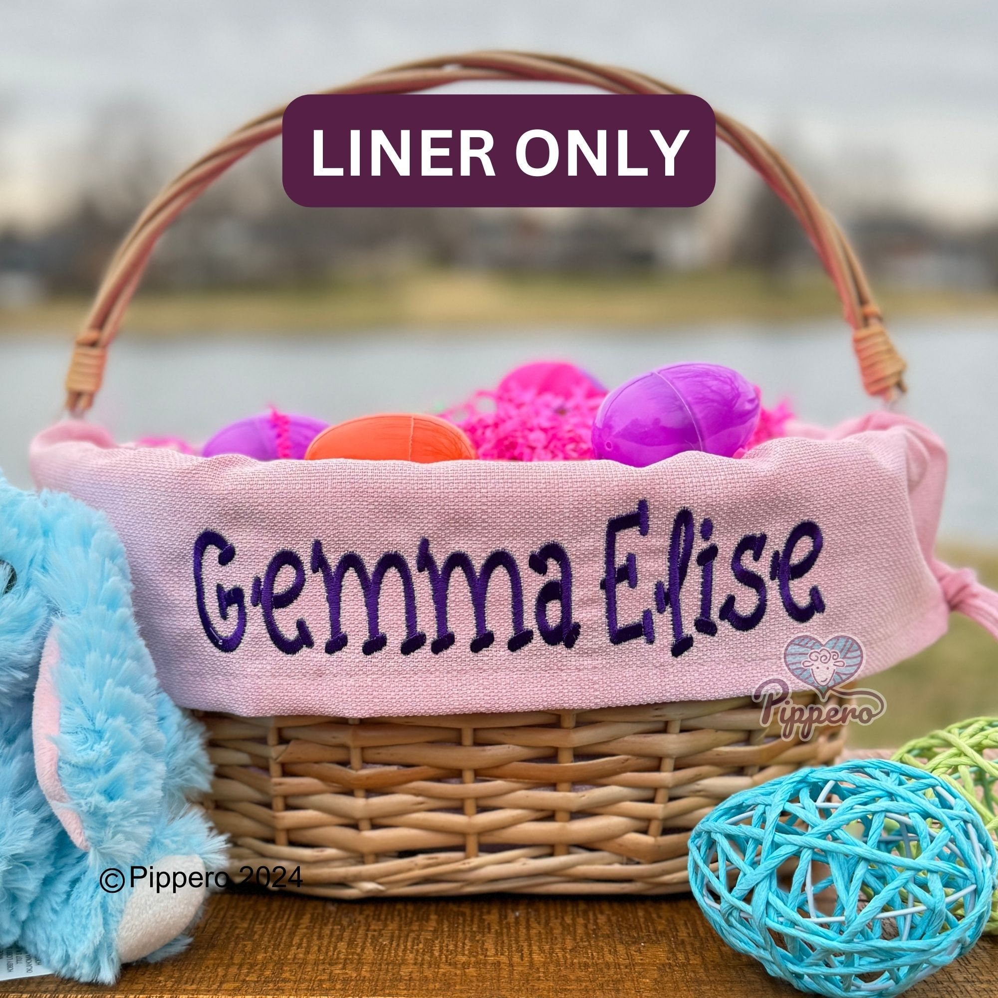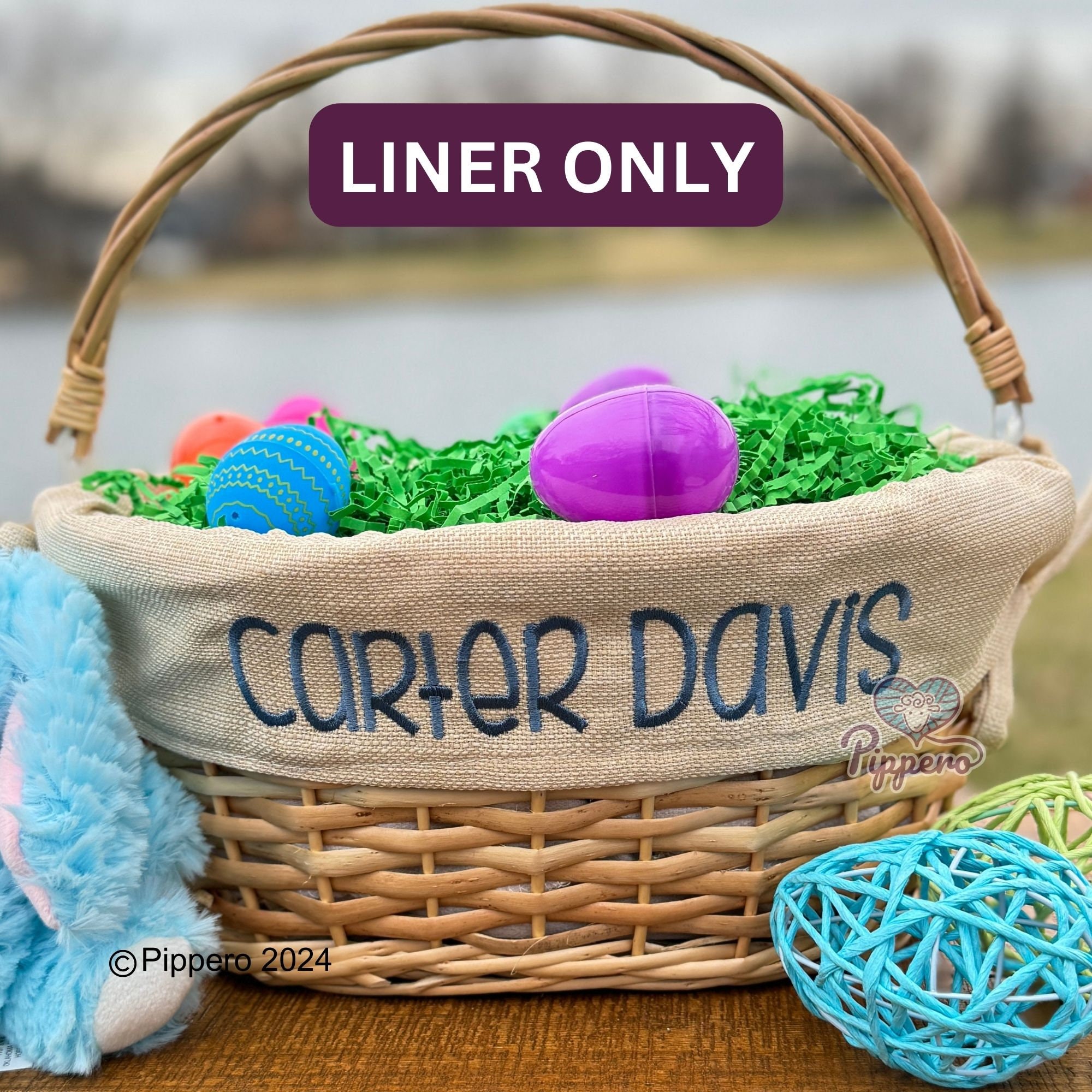 Easter is just around the corner! Decorate your own wicker Easter basket with a personalized embroidered solid liner. The liner features your child's name embroidered on it, professionally embroidered with high-quality thread that will last a lifetime. These liners are beautiful solid pastel spring colors in blue, cream, pink, or tan.