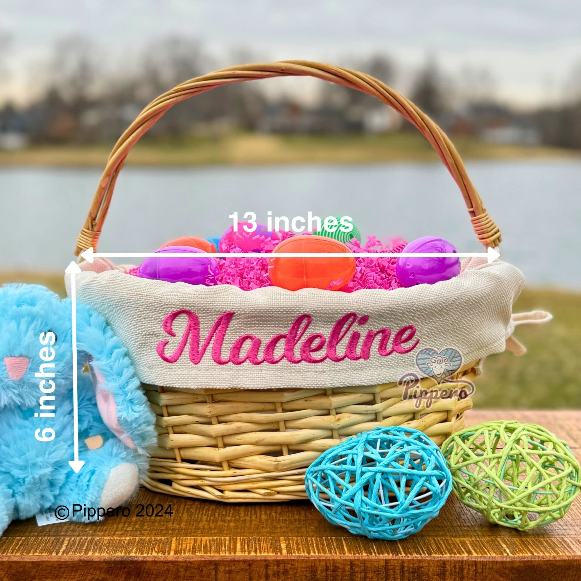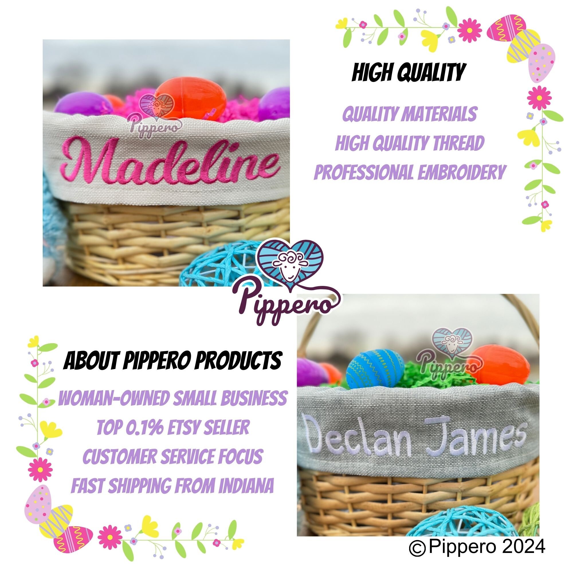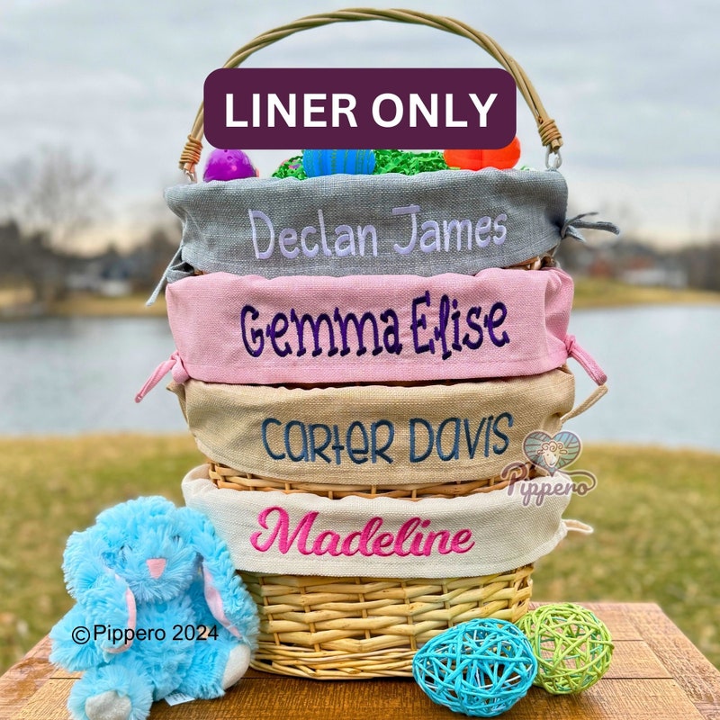 Easter is just around the corner! Decorate your own wicker Easter basket with a personalized embroidered solid liner. The liner features your child's name embroidered on it, professionally embroidered with high-quality thread that will last a lifetime. These liners are beautiful solid pastel spring colors in blue, cream, pink, or tan.