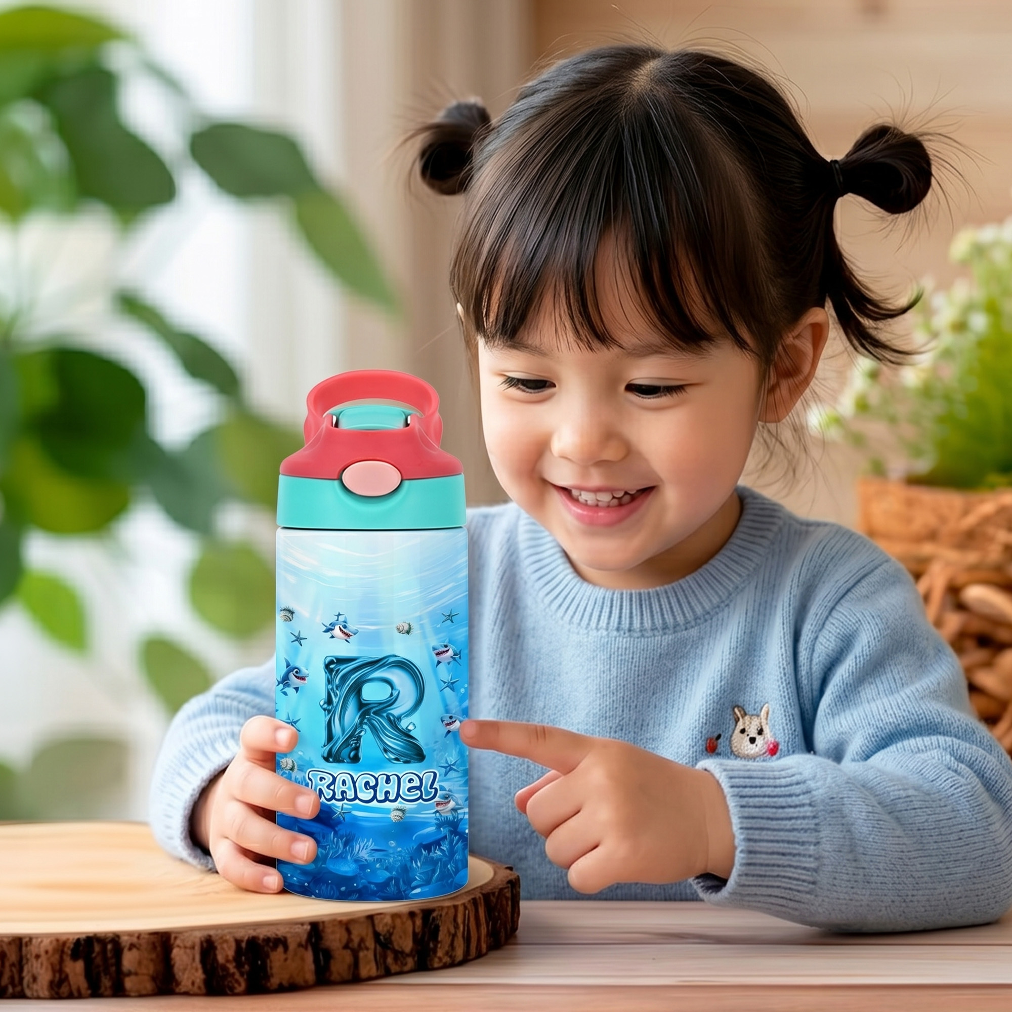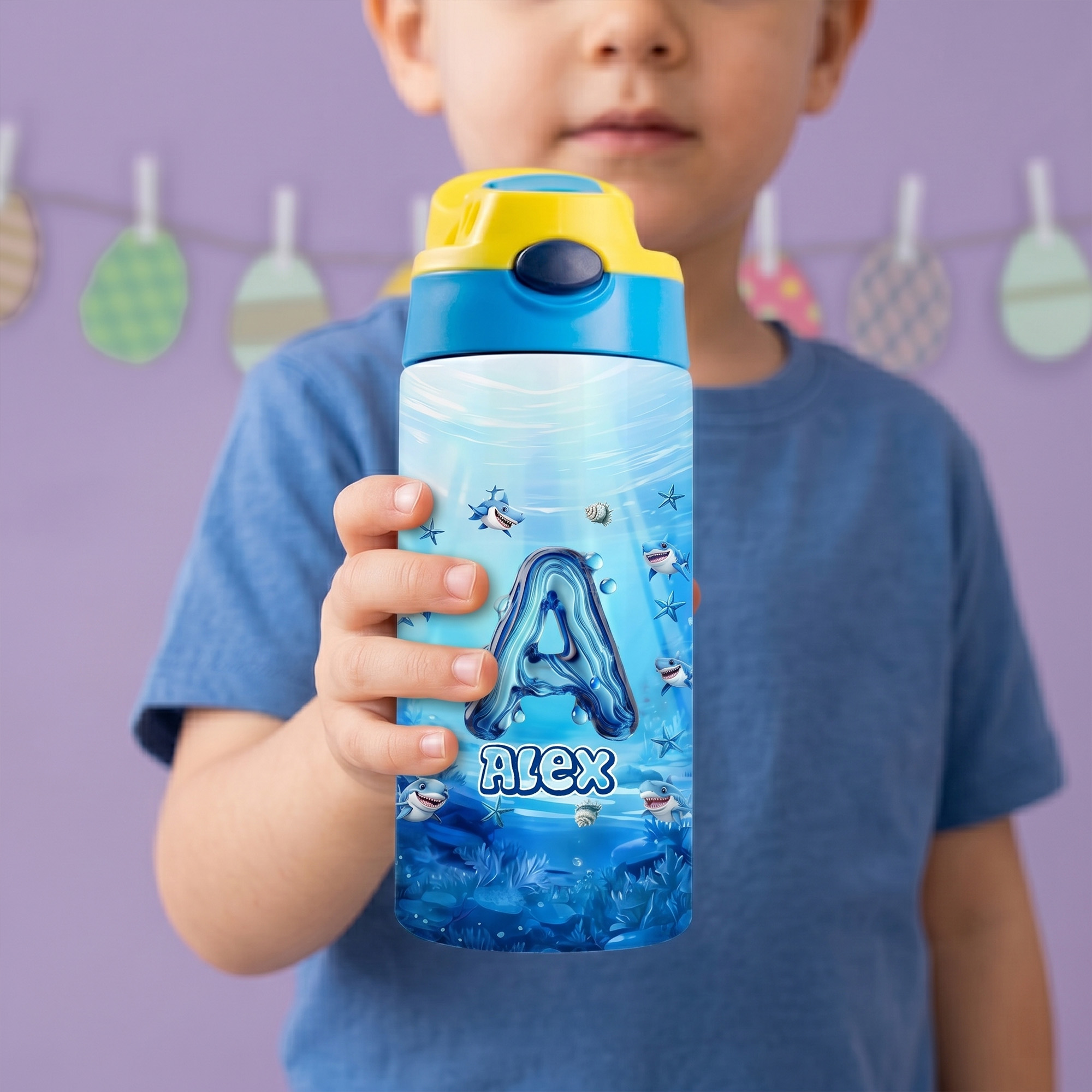 Underwater Alphabet Design - This 12oz stainless steel water bottle features a fun underwater world theme with colorful ocean animals and an alphabet letter. The playful shark and sea creature design creates a cheerful and adventurous style that kids will love carrying to school, sports, or outings.