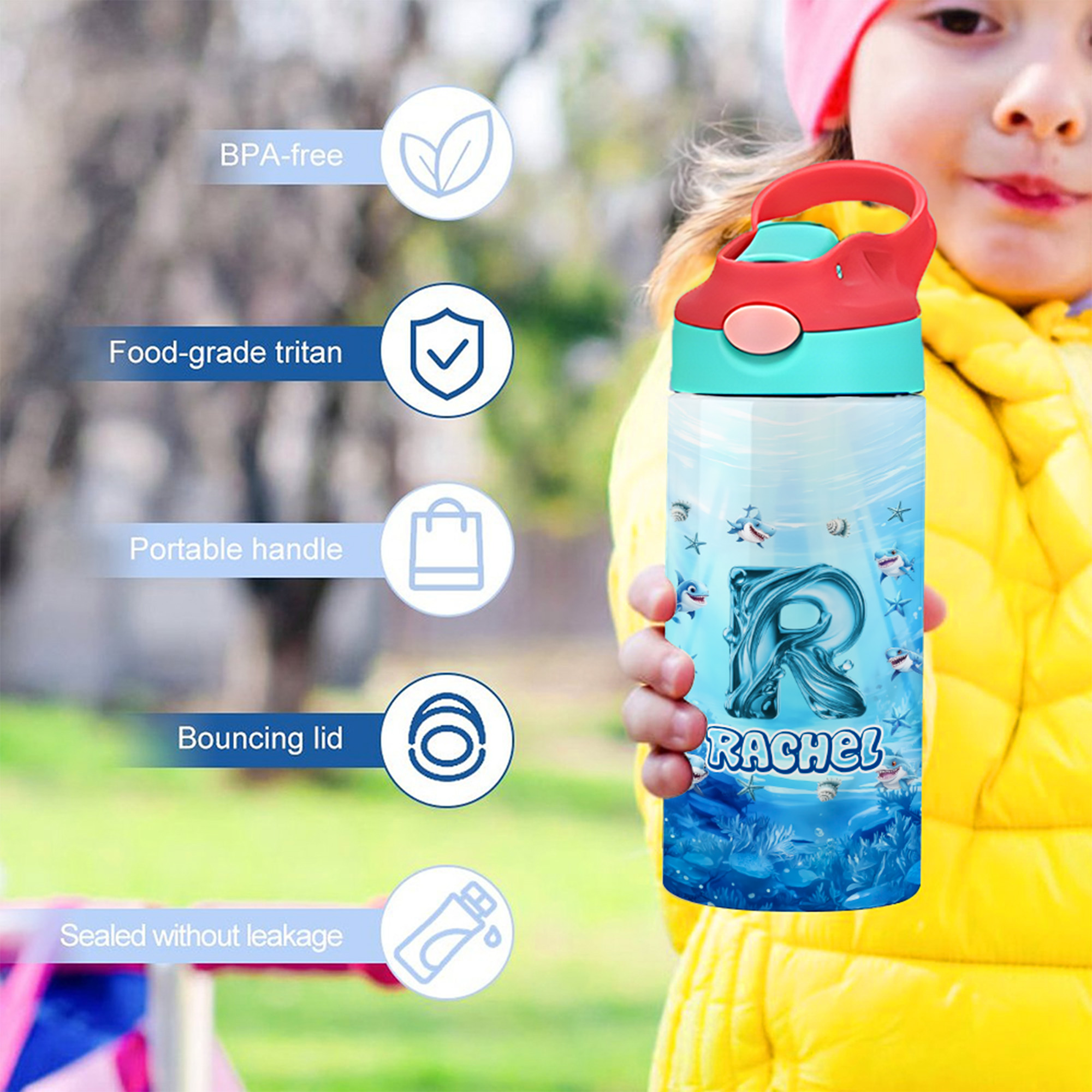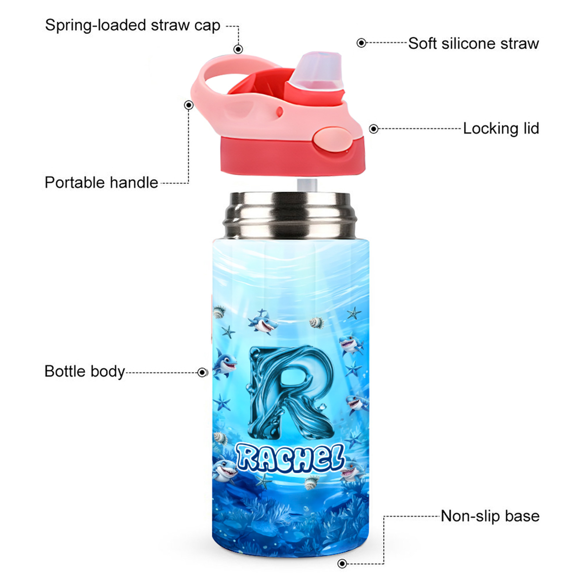Personalized Name Underwater World Alphabet Water Bottle, Stainless Steel 12oz Tumbler with Straw & Lid, Back to School/Birthday Gift for Kids