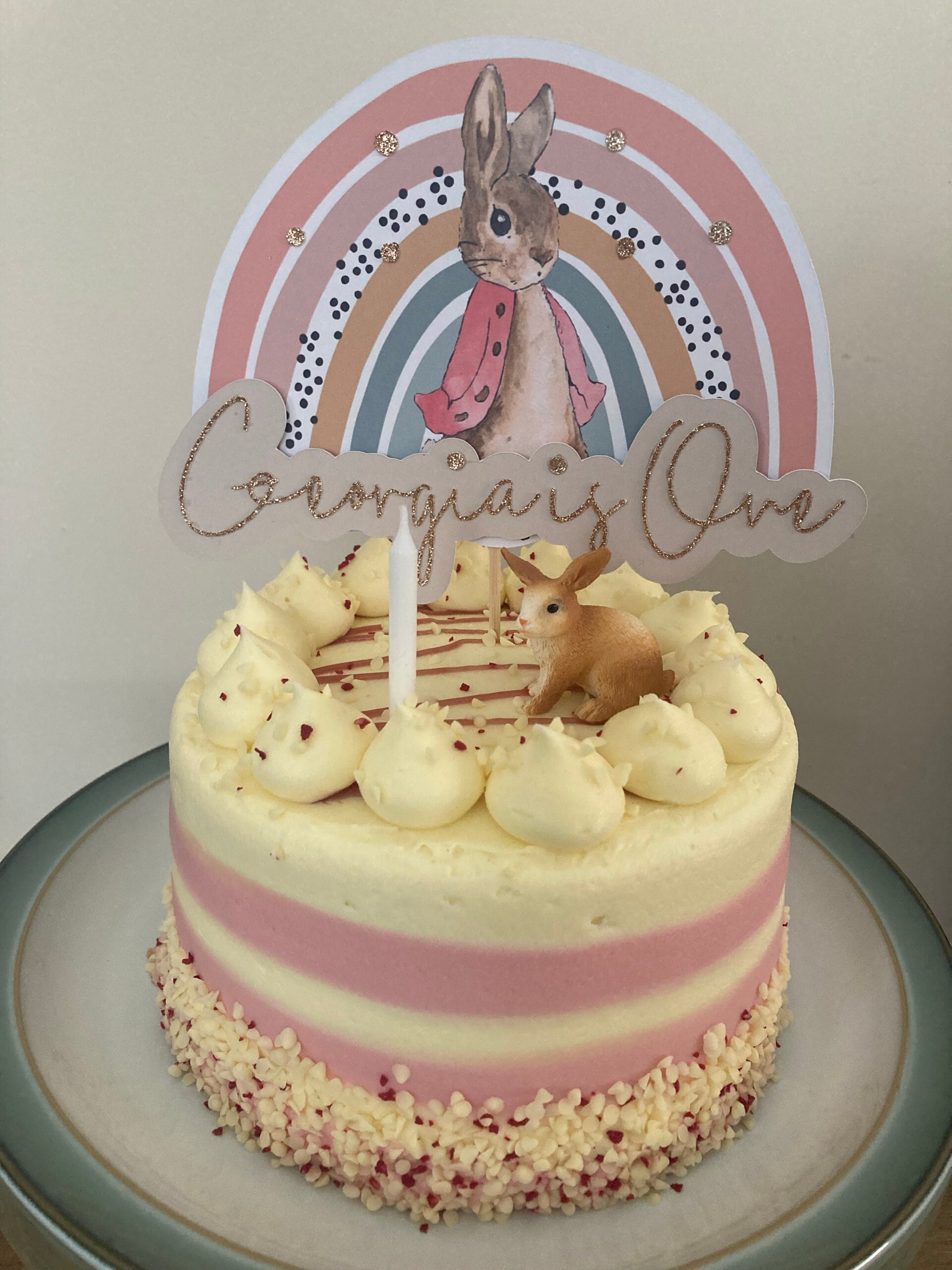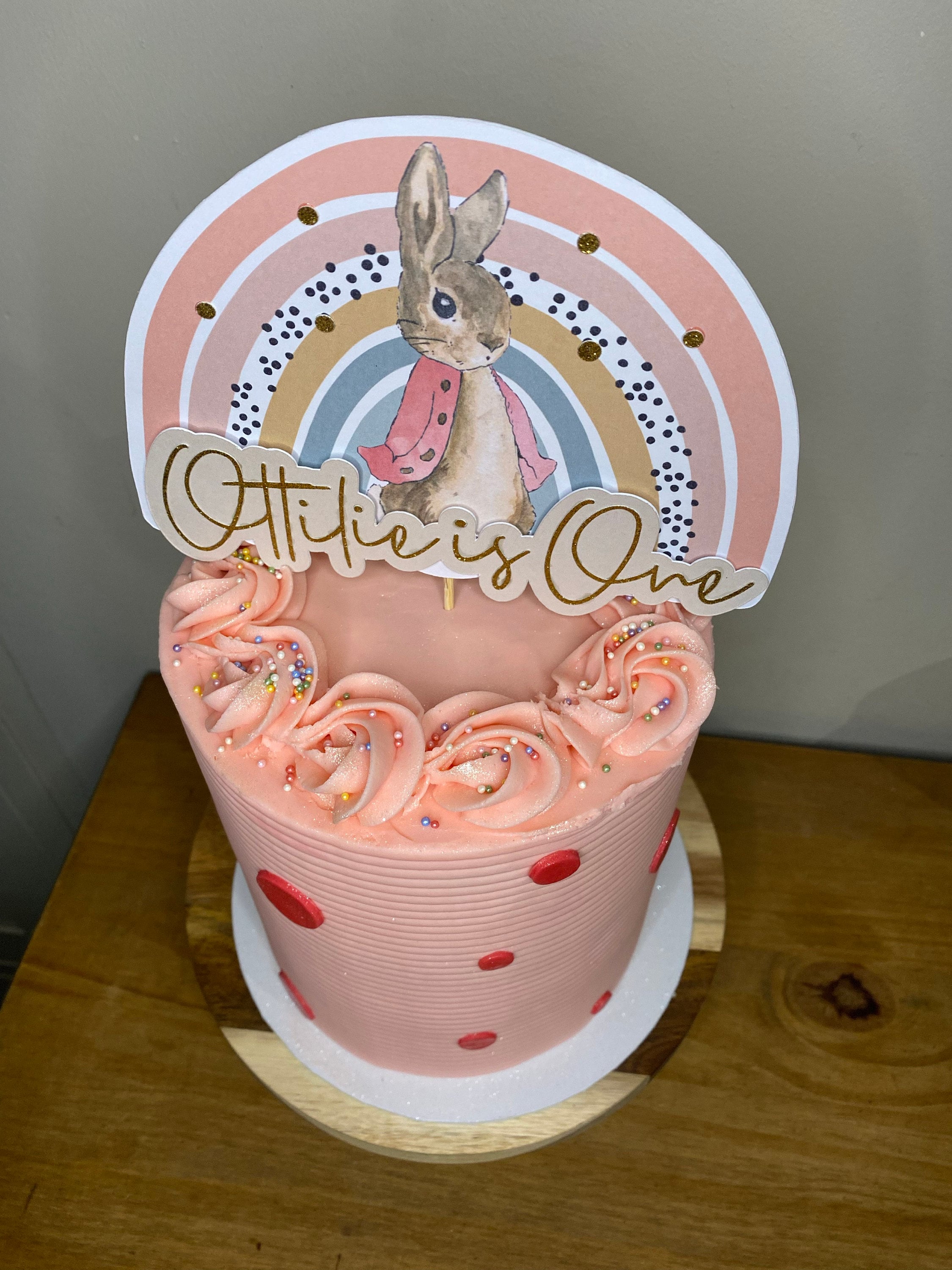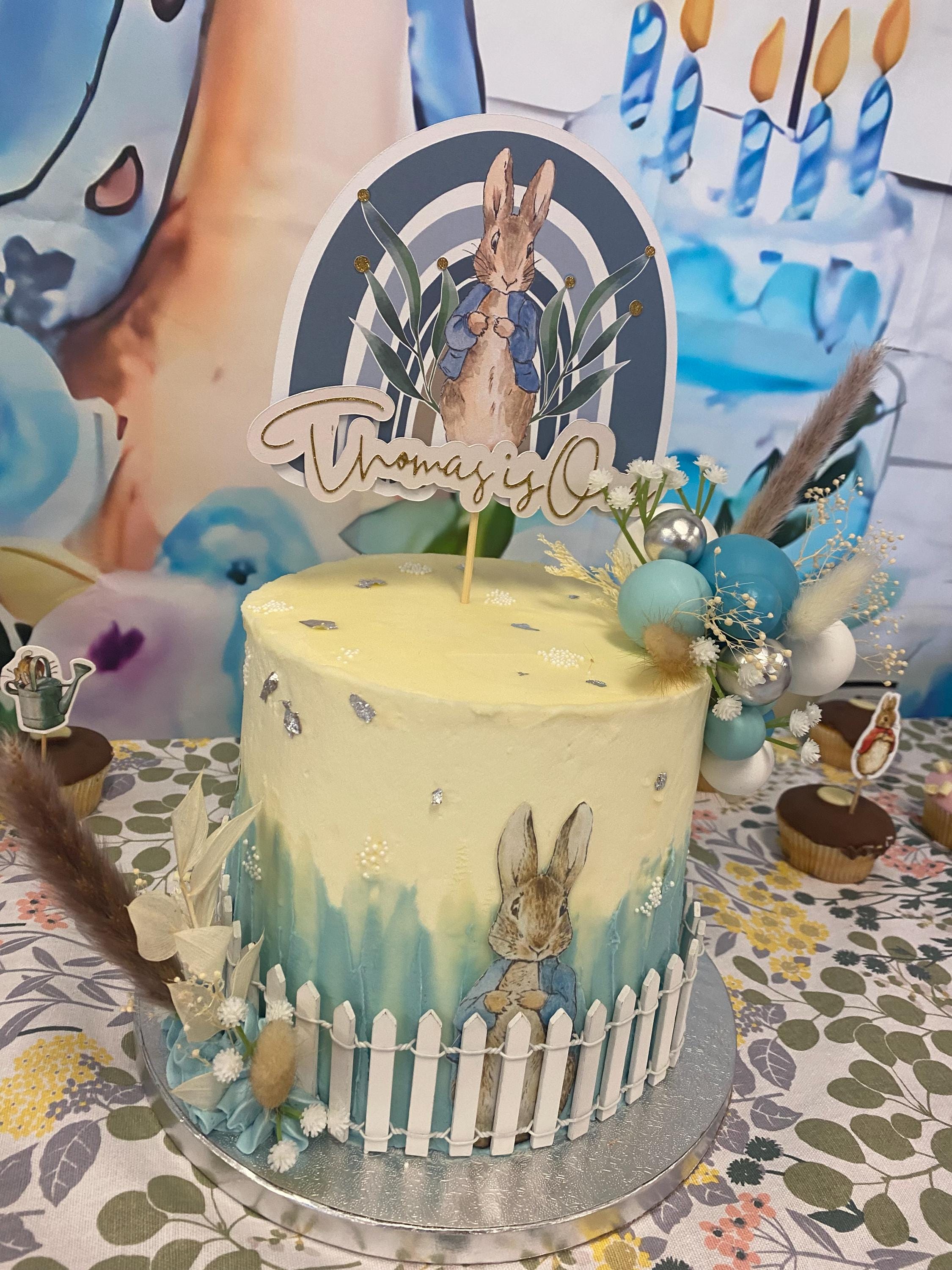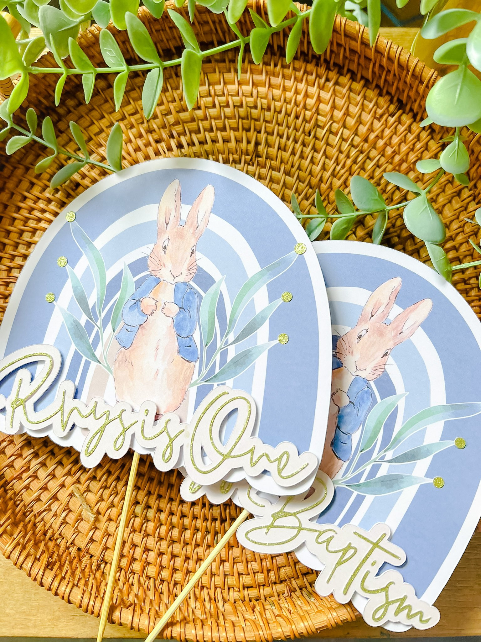 Peter Rabbit name topper, comes with a stick to insert directly into the cake